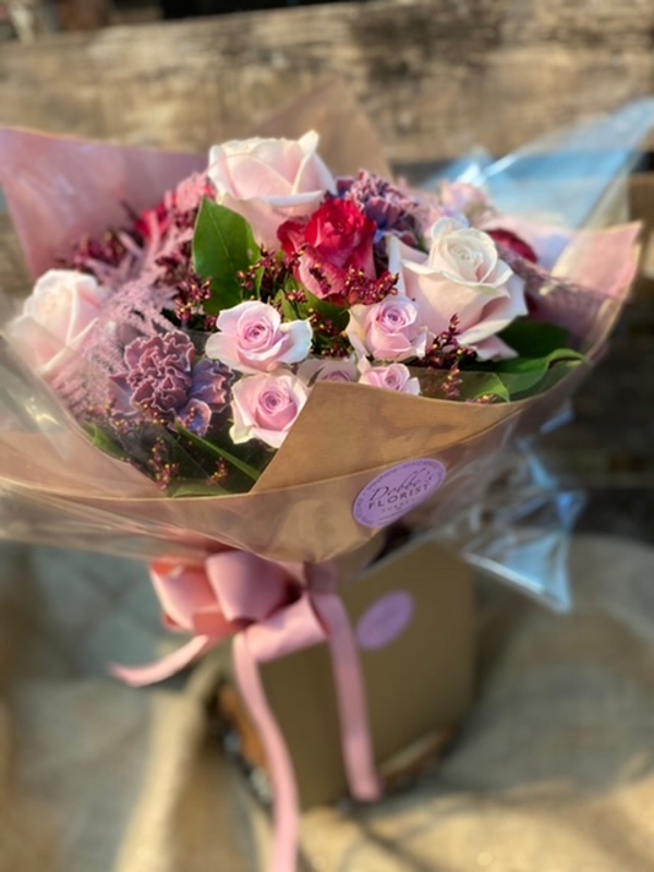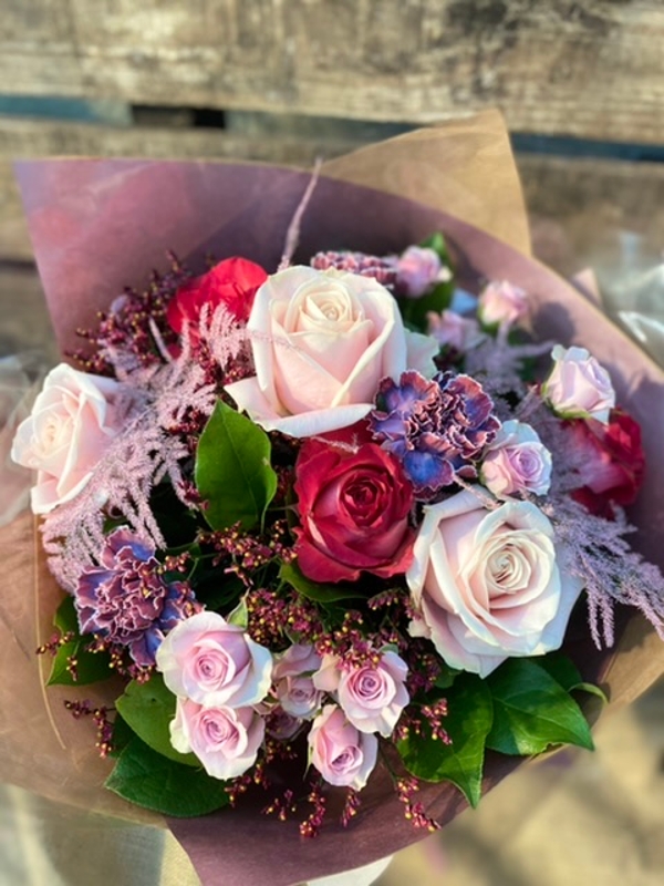 Gorgeous tones of mixed pink roses combined perfectly with coloured ferns for this beautiful bouquet.