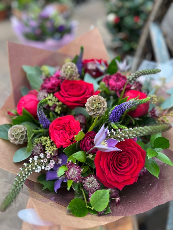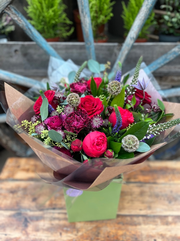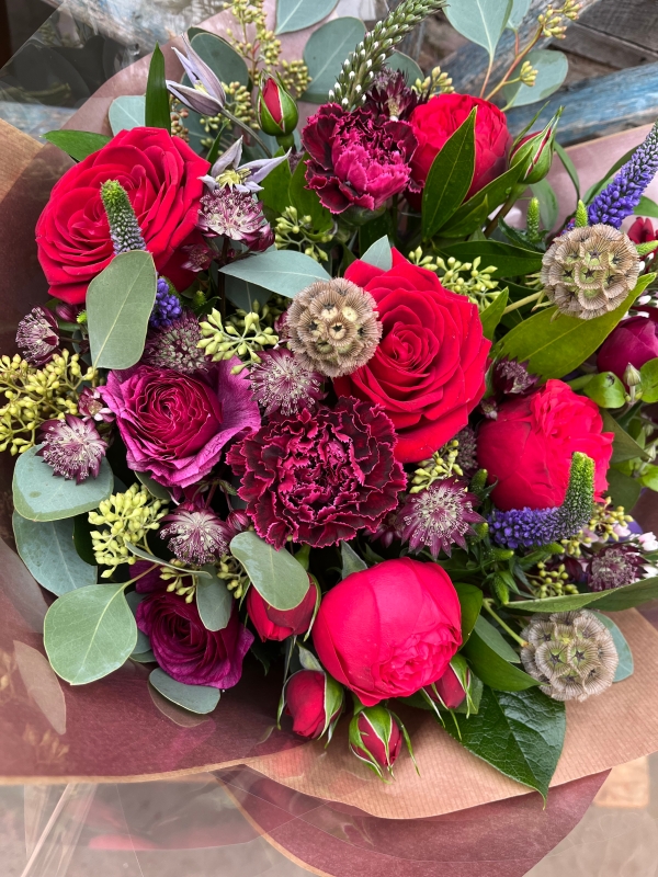A delicious dark red and purple bouquet filled with roses and eucalyptus with seasonal flowers. Presented for immediate enjoyment in water and gift box.